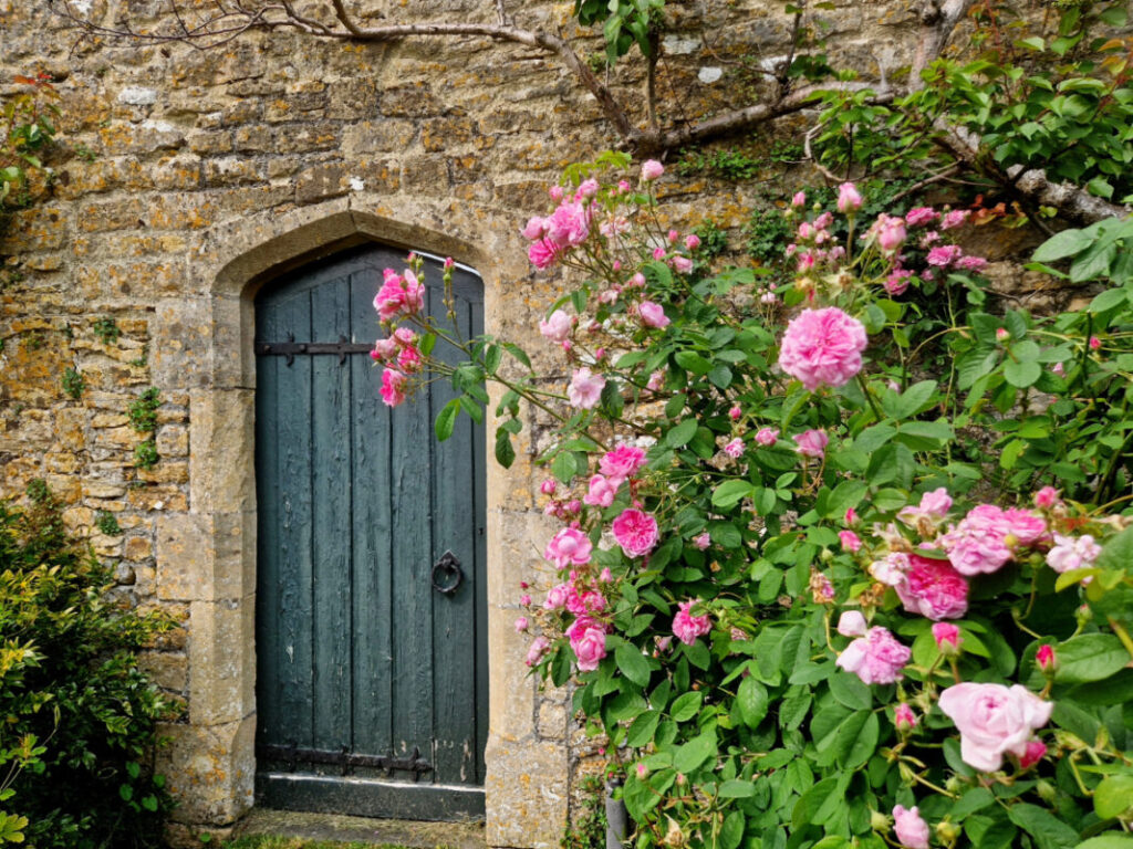 Stone arch with an open door. Pink roses are climbing up the wall to the right of the photo.