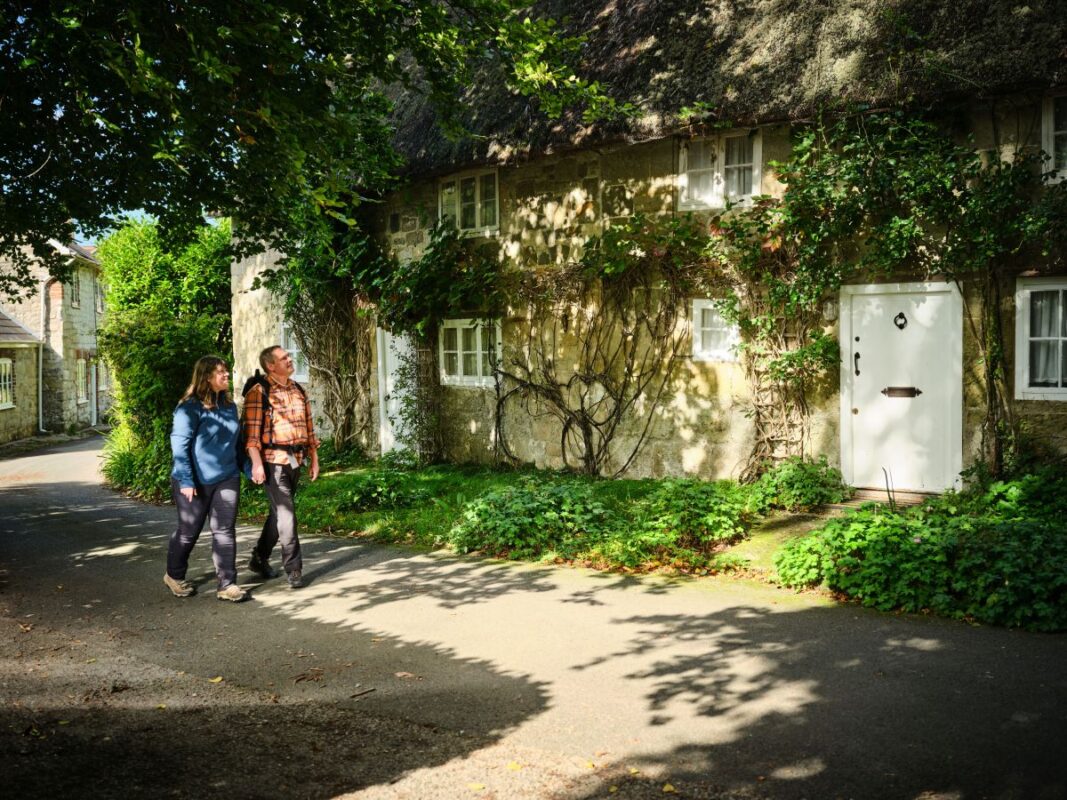 Two walkers walk past a traditional cottage in dappled sunlight.