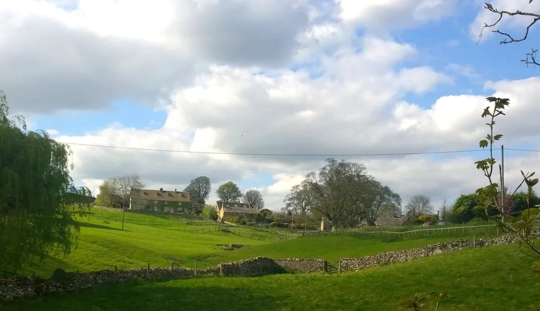 Green fields in the Cotswolds with a drystone wall running through and traditional stone cottages in the background.