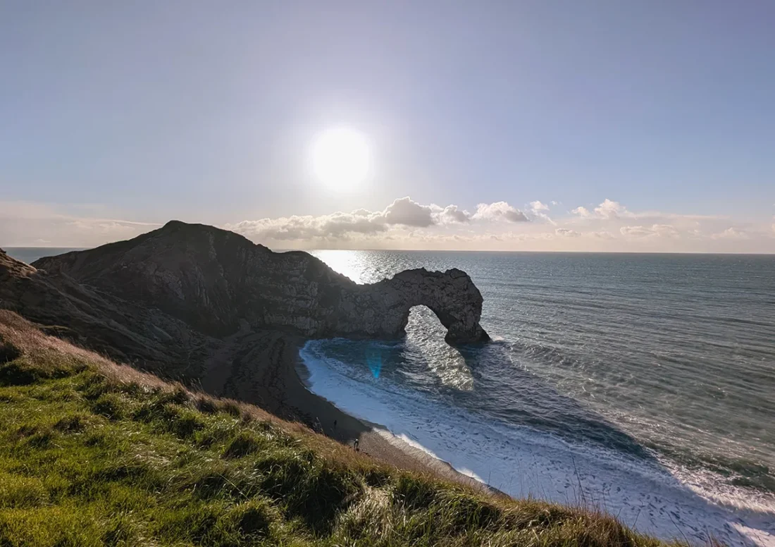 Image of Durdle Door on a sunny day: A natural stone arch jutting out into the sea. The sun behind the arch casts long shadows on the beach. The photo is taken from the South West Coast Path on a cliff looking down on the arch.